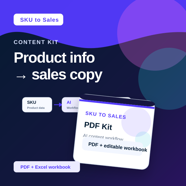 Organize product inputs, copy variants, SEO/AEO ideas, repurposing outputs, quality checks, and experiment signals in one workbook.